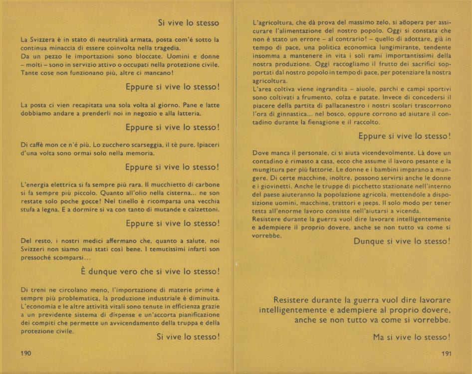 Nel 1969 tutti i fuochi svizzeri ricevettero il libretto «Difesa civile» con lo slogan «Si vive lo stesso». Con questa pubblicazione, il Consiglio federale intendeva preparare la popolazione a una situazione d’emergenza correlata a una guerra all’estero.